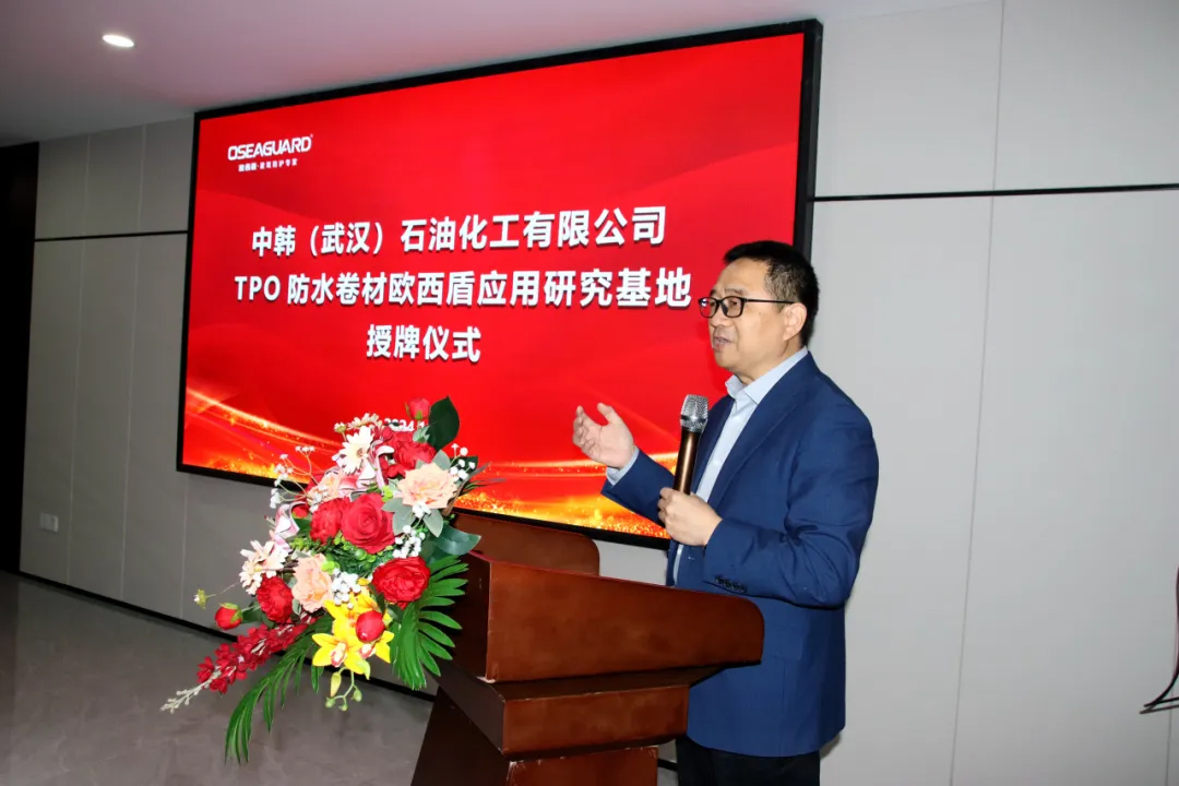 中韓(武漢)石油化工有限公司黨委書記、董事長、總經理劉百強為歐西盾TPO防水卷材應用研發基地授牌,至此,雙方合作邁入嶄新階段,將共同致力于推動中韓石化超軟聚丙烯在TPO防水卷材領域的技術革新與應用拓展。