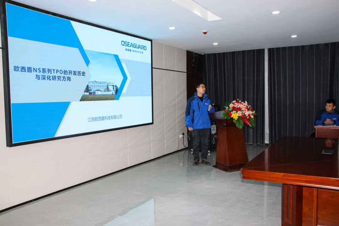 歐西盾防水總工程師顧金佳向大家介紹了《歐西盾NS系列TPO 的開發歷史與深化研究方向》,闡述了TPO防水卷材的發展史、歐西NS06應用歷程、NS應用研究方向探討,并就應用研究基地的合作內容與方向和與會的領導們展開了討論。